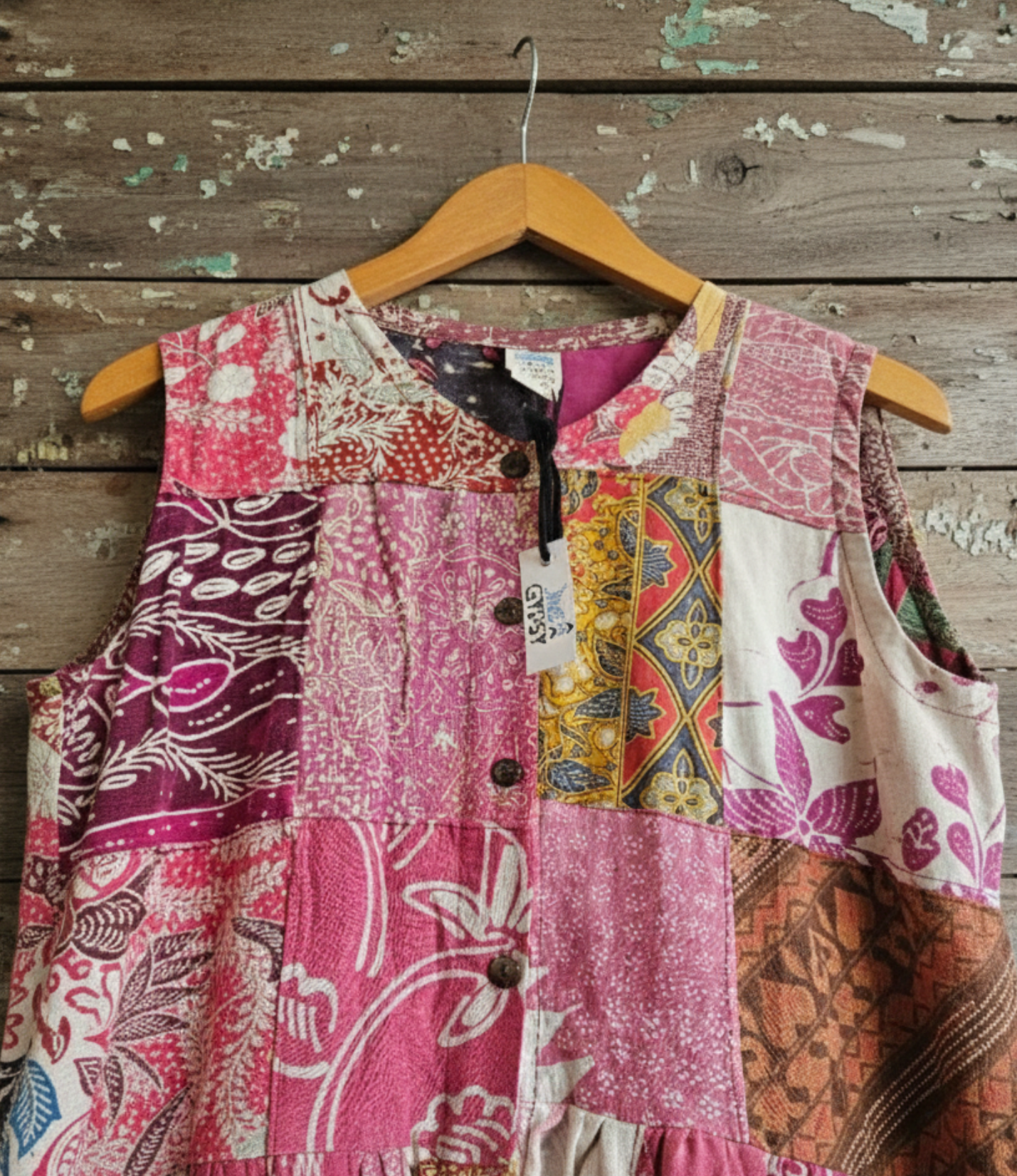 Fun sleeveless dress! The variety of prints used in the squares, go very well together. Construction quality appears to be good -- fabric is medium weight, suitable for spring or fall tossed over a tee; the hidden side pockets are lined in the same fabric. The attached side ties go either in front or back, but are not long enough to wrap all the way around. My dress was longer than expected, it's actually 50" long, but since I am a bit on the shorter side, am used to having clothes altered. Well worth the price,